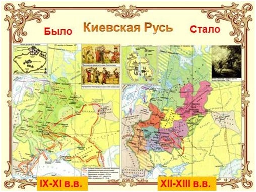 Учитель предлагает детям сравнить карты «Киевская Русь» в IX-XI и XII-XIII в.в. и выяснить, что изменилось.