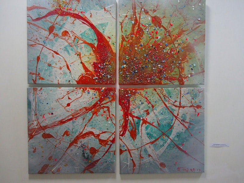 У декоративных полотен Егора Кукушкина есть свое лицо. Они узнаваемы, хорошо смотрятся, но им тоже не хватает пространства, такое ощущение, что соседство им вроде помехи. Морскую продолжает его новая тема — «Будимир» – славянское имя, обозначающее «пробуждающий мир». Одна композиция из четырех холстов производит впечатление большого взрыва.